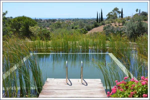 When planning the Quinta Lusitana, the owners took care to use natural materials and to build an architecture in the style typical of the country, which blends harmoniously into the existing surroundings. An impressive biotope was created directly in front of the large terrace, in which, in addition to various aquatic plants, frogs also feel comfortable and occasionally give a small concert. This aquatic paradise has a square pool in the middle, so you can swim in the biotope without coming into contact with the plant and animal inhabitants that ensure the pool's natural balance. The view goes through the water plants to the coastline.